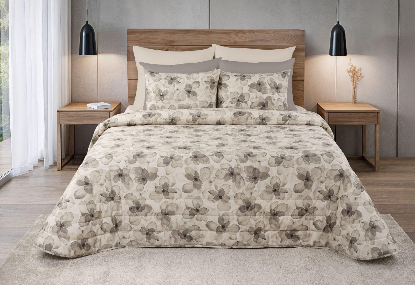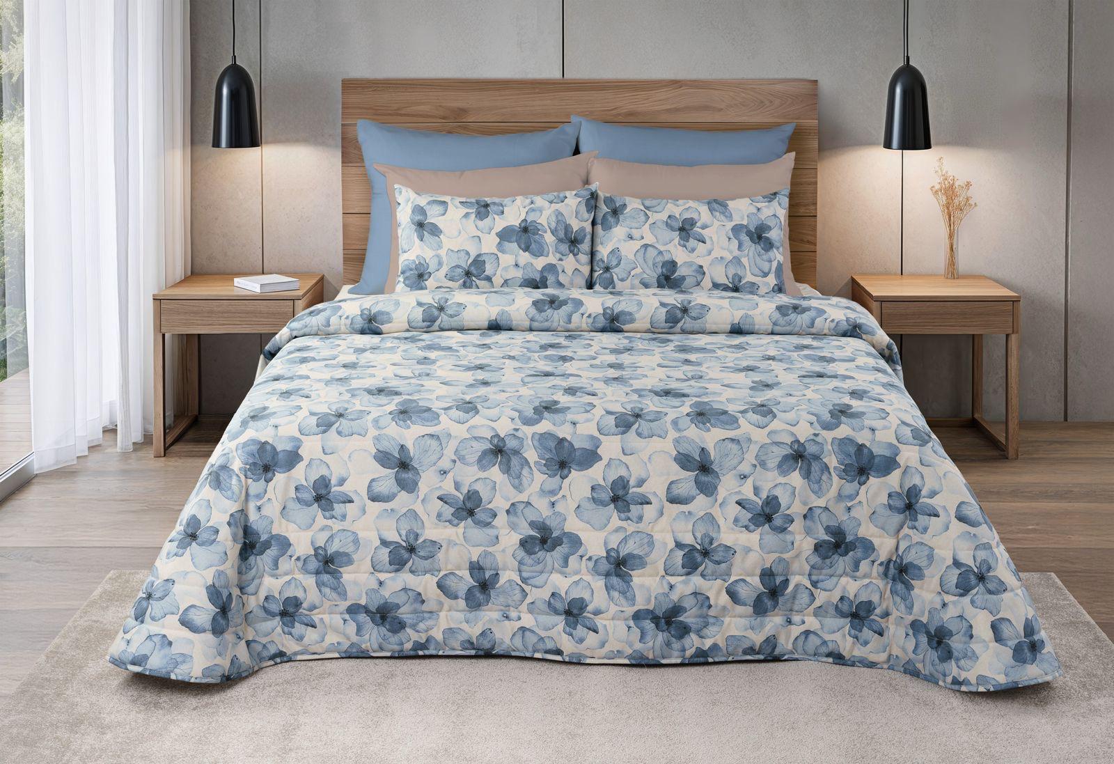 Colcha de casal com padrão estampado.
