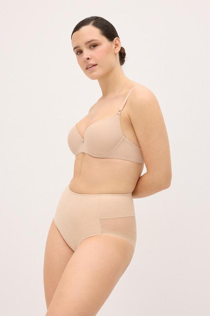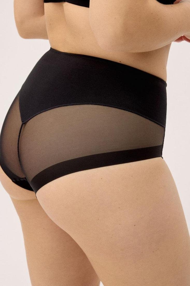 - Calcinha de cintura alta em algodão com acabamento em tule invisível. Proporciona um efeito de compressão abdominal que define levemente a silhueta sem compressão excessiva. Perfeita para o dia a dia ou para quem prefere uma peça modeladora com compressão mais leve.