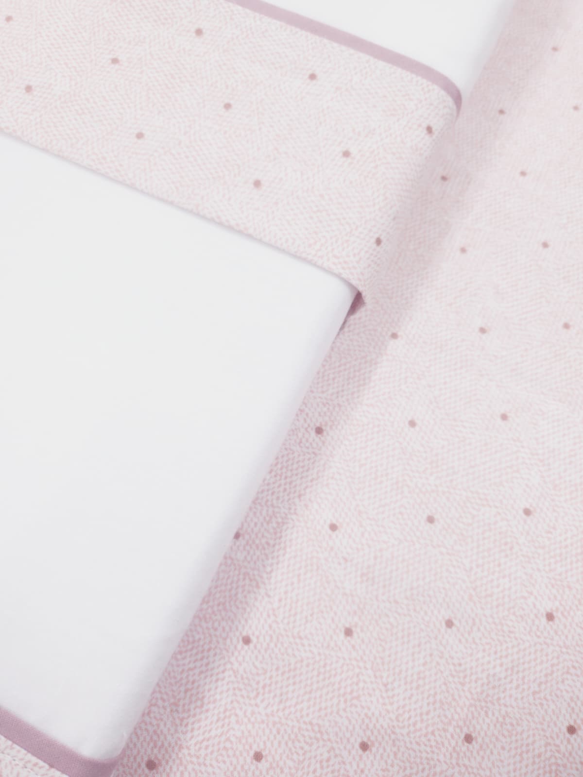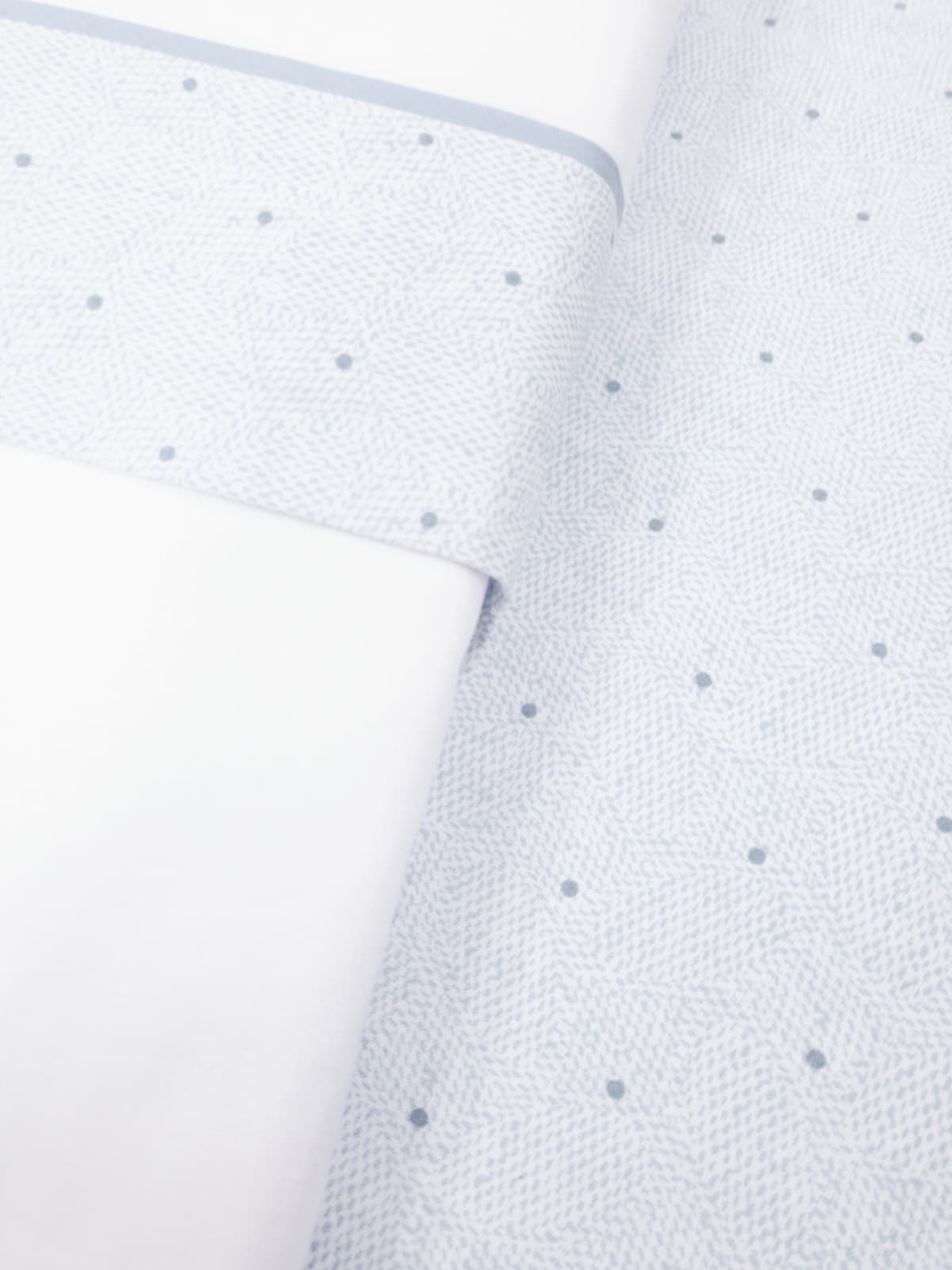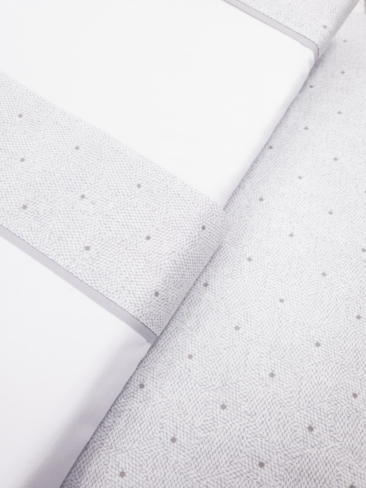 Jogo de cama em algodão, com estampado no lençol de baixo, barra do lençol de cima e fronhas.