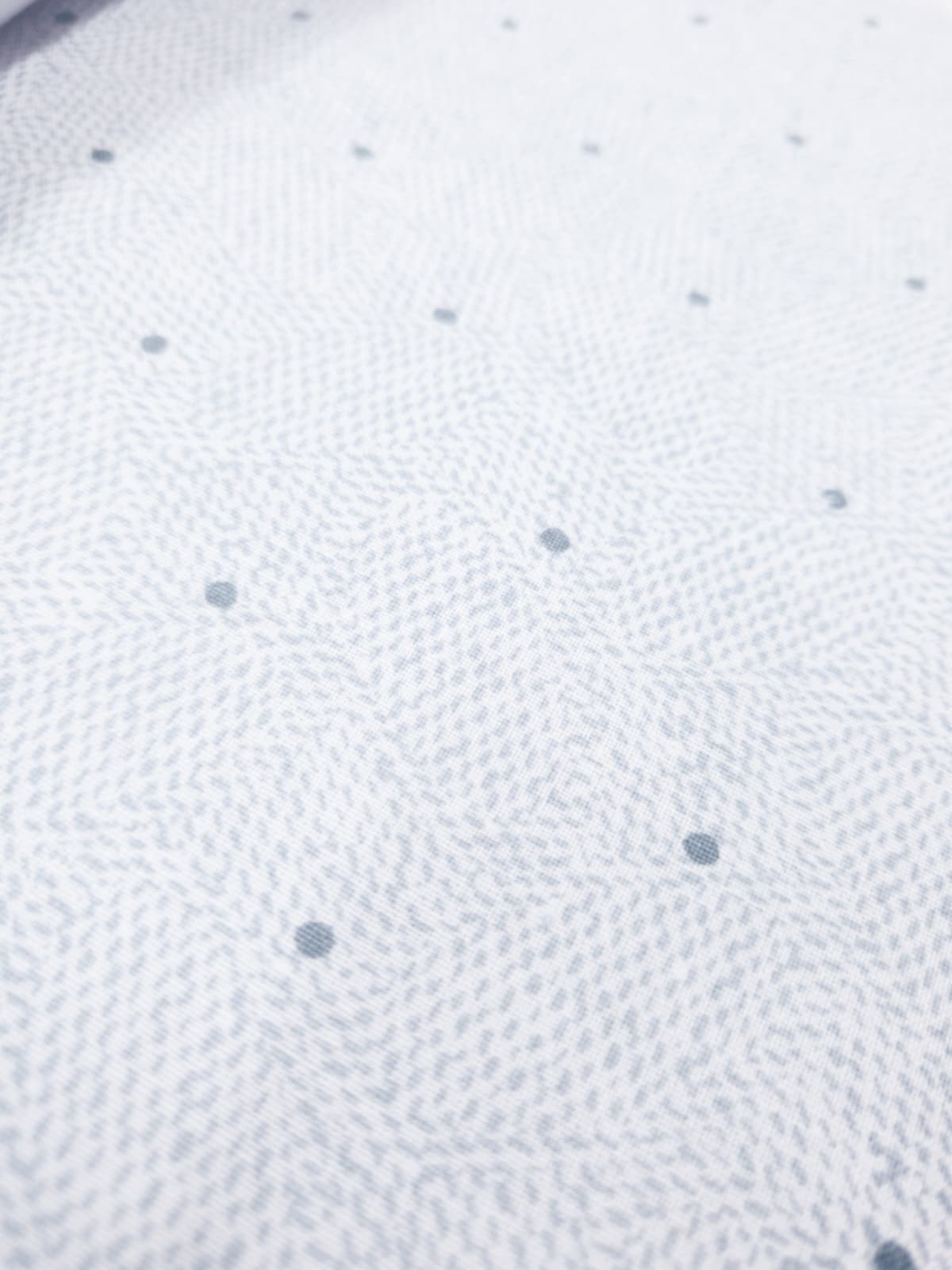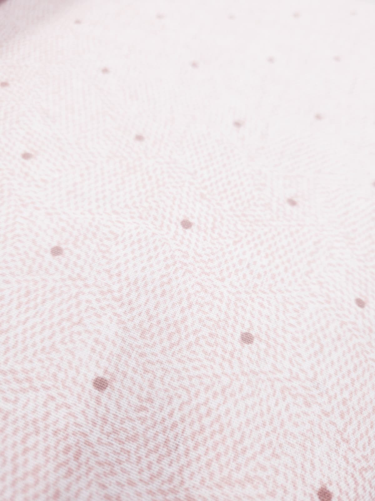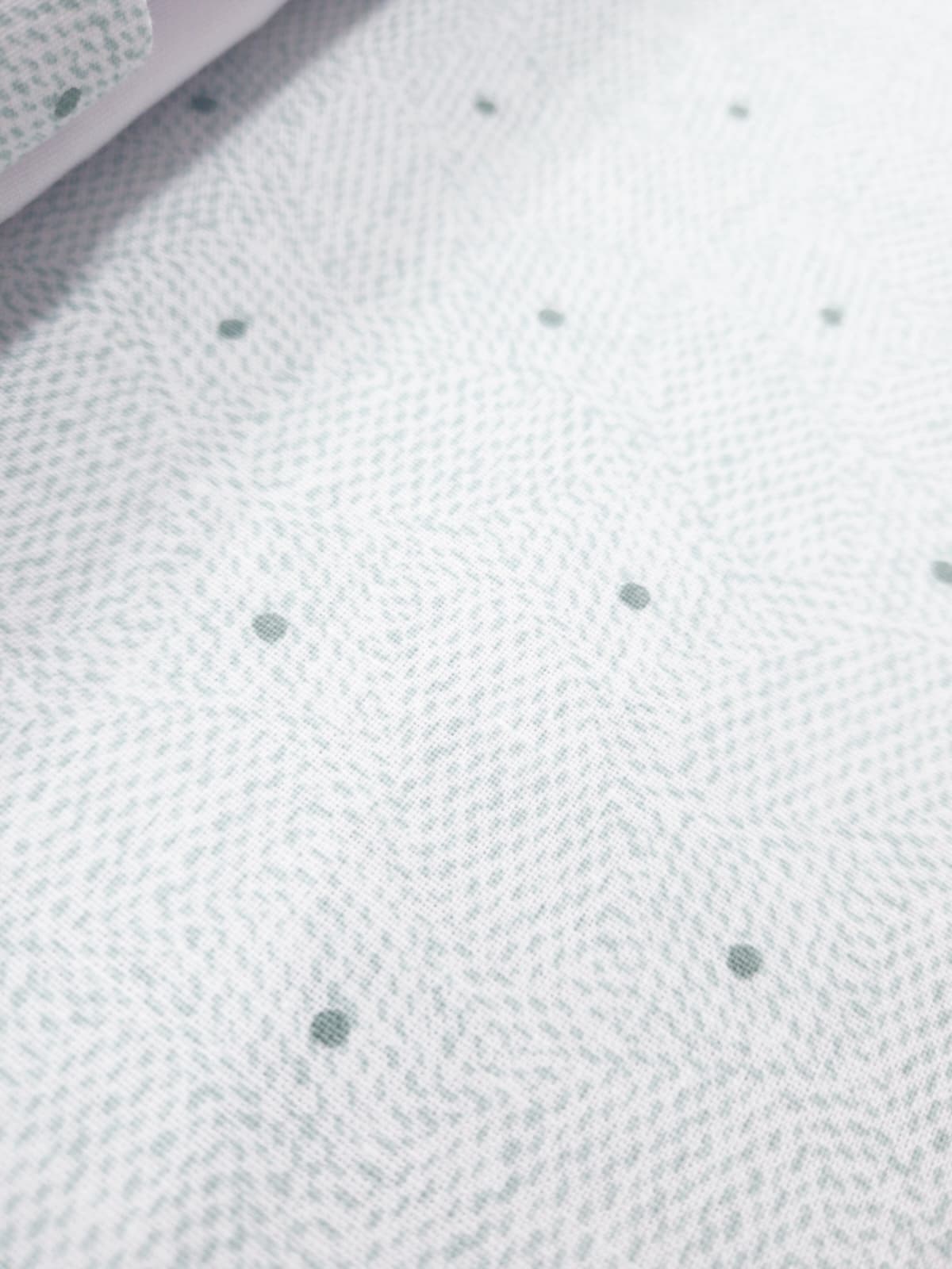 Jogo de cama em algodão, com estampado no lençol de baixo, barra do lençol de cima e fronhas.