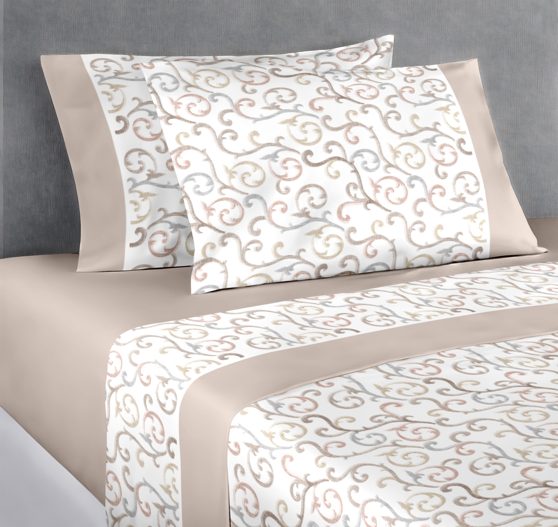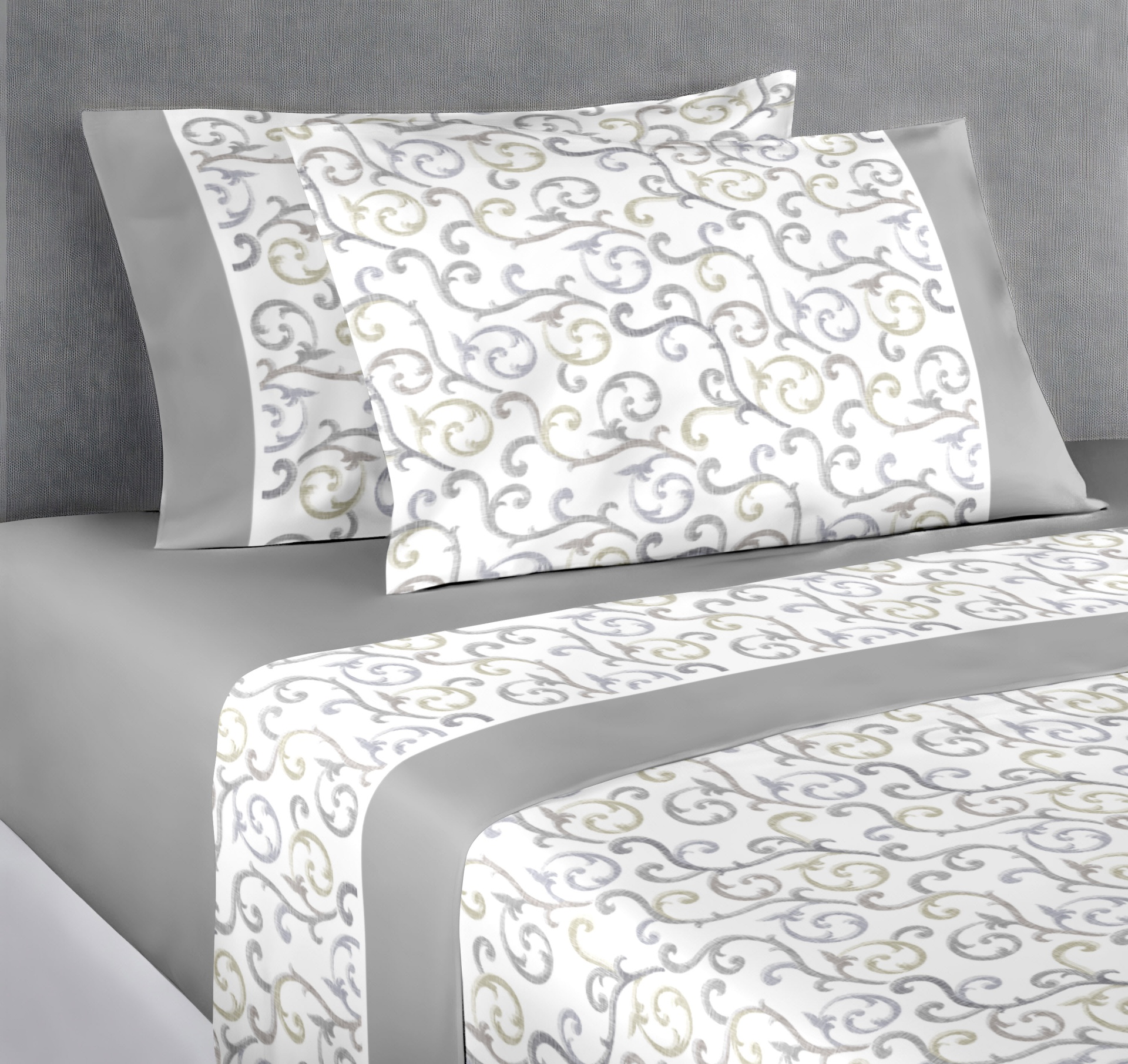 Jogo de cama em algodão, com estampado no lençol de cima e fronhas.