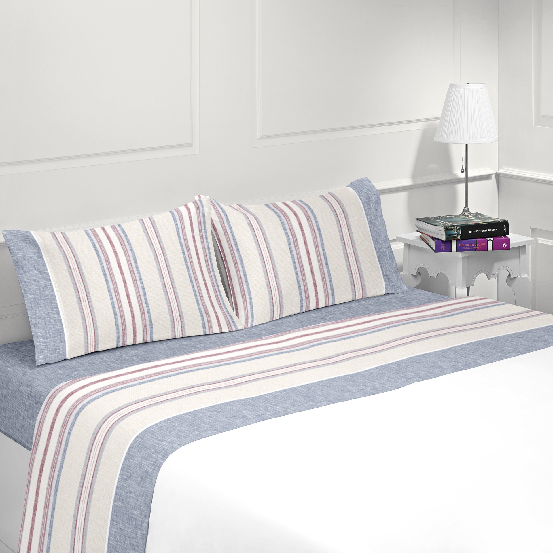 Jogo de cama em algodão, com estampado no lençol de cima e fronhas.