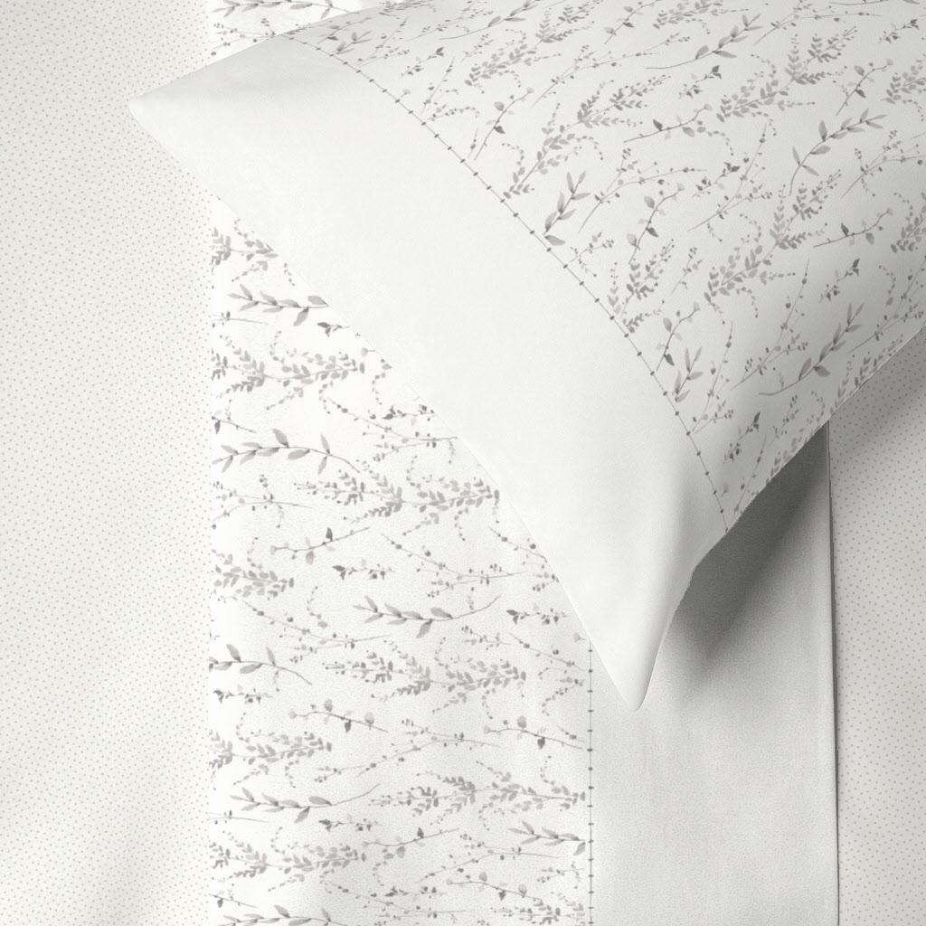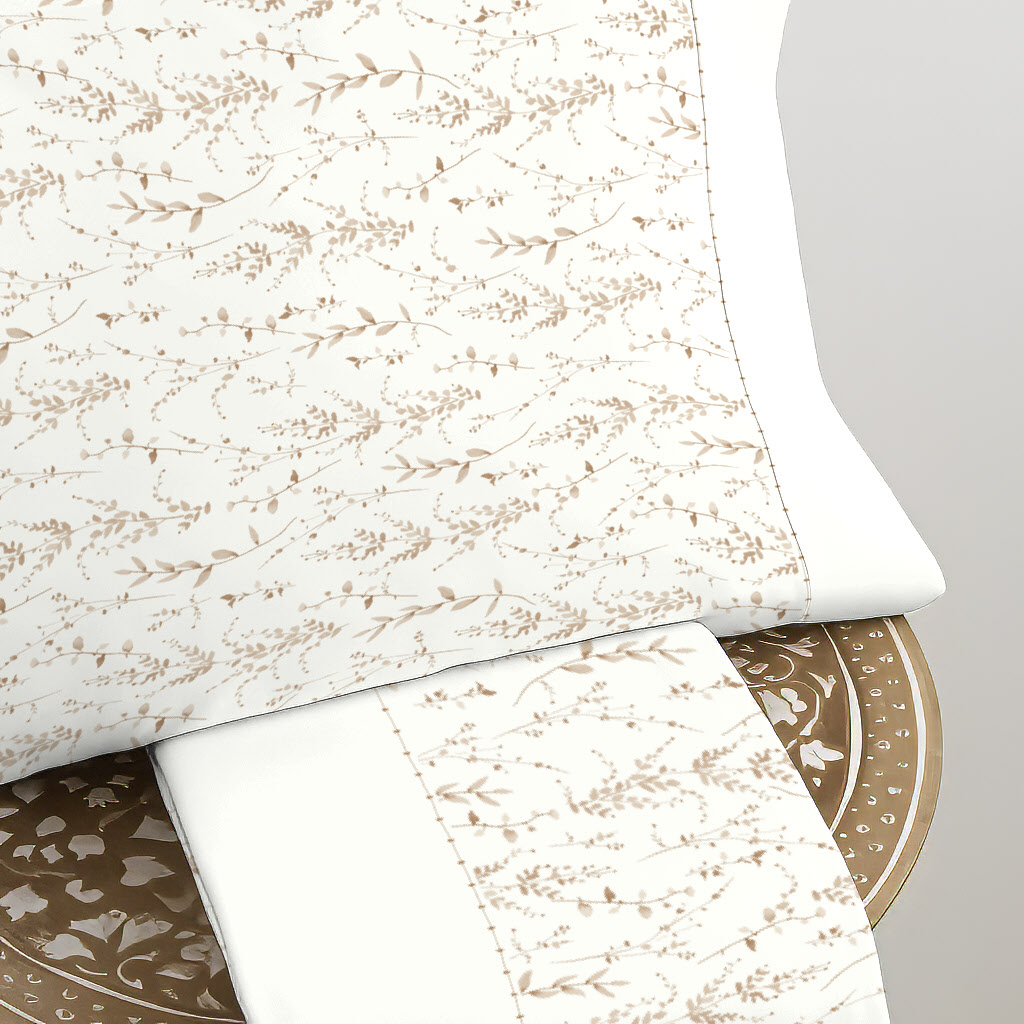 Estampado no lençol de baixo, ajustável e fronhas com desenho referente à natureza.