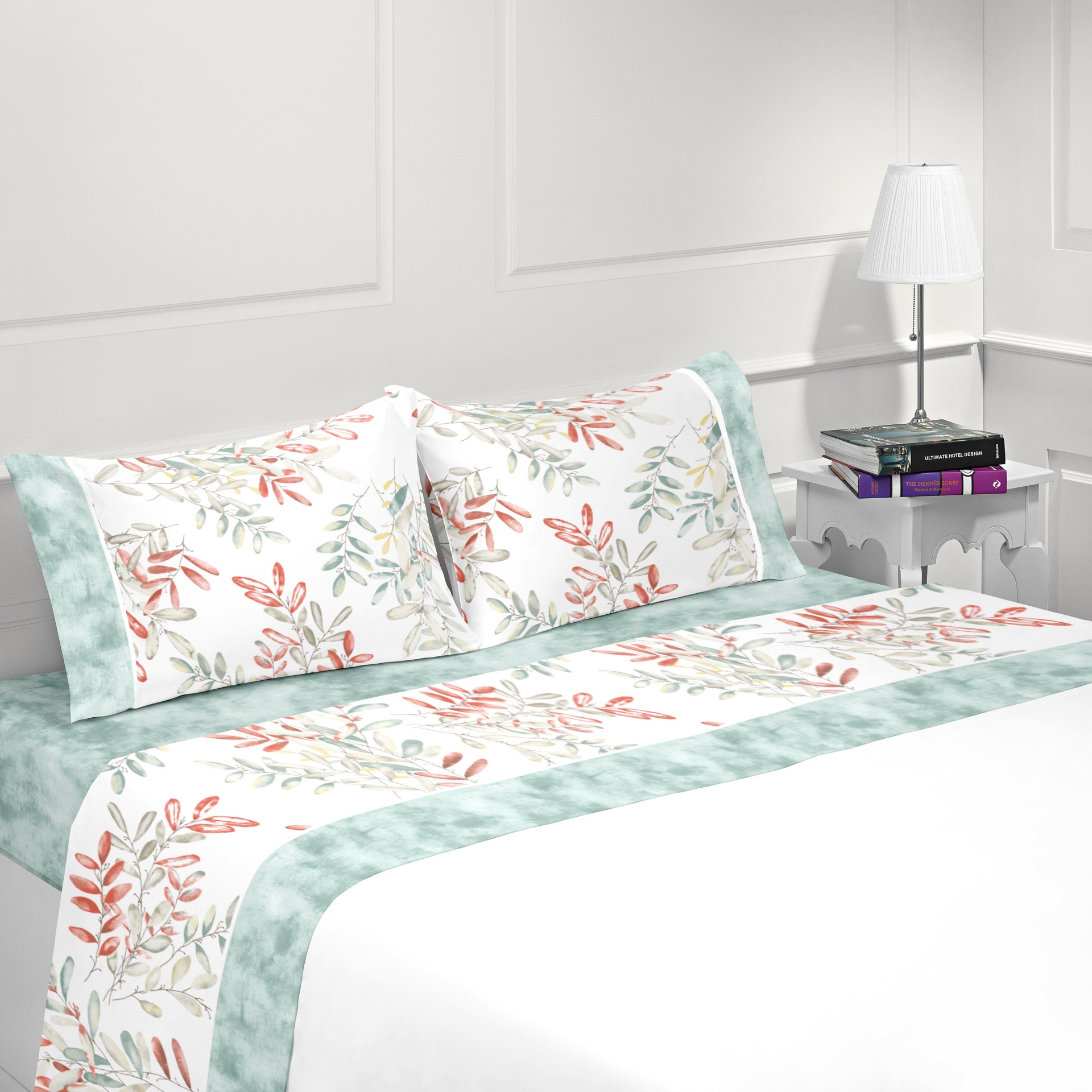 Jogo de cama em algodão, com estampado no lençol de cima e fronhas.