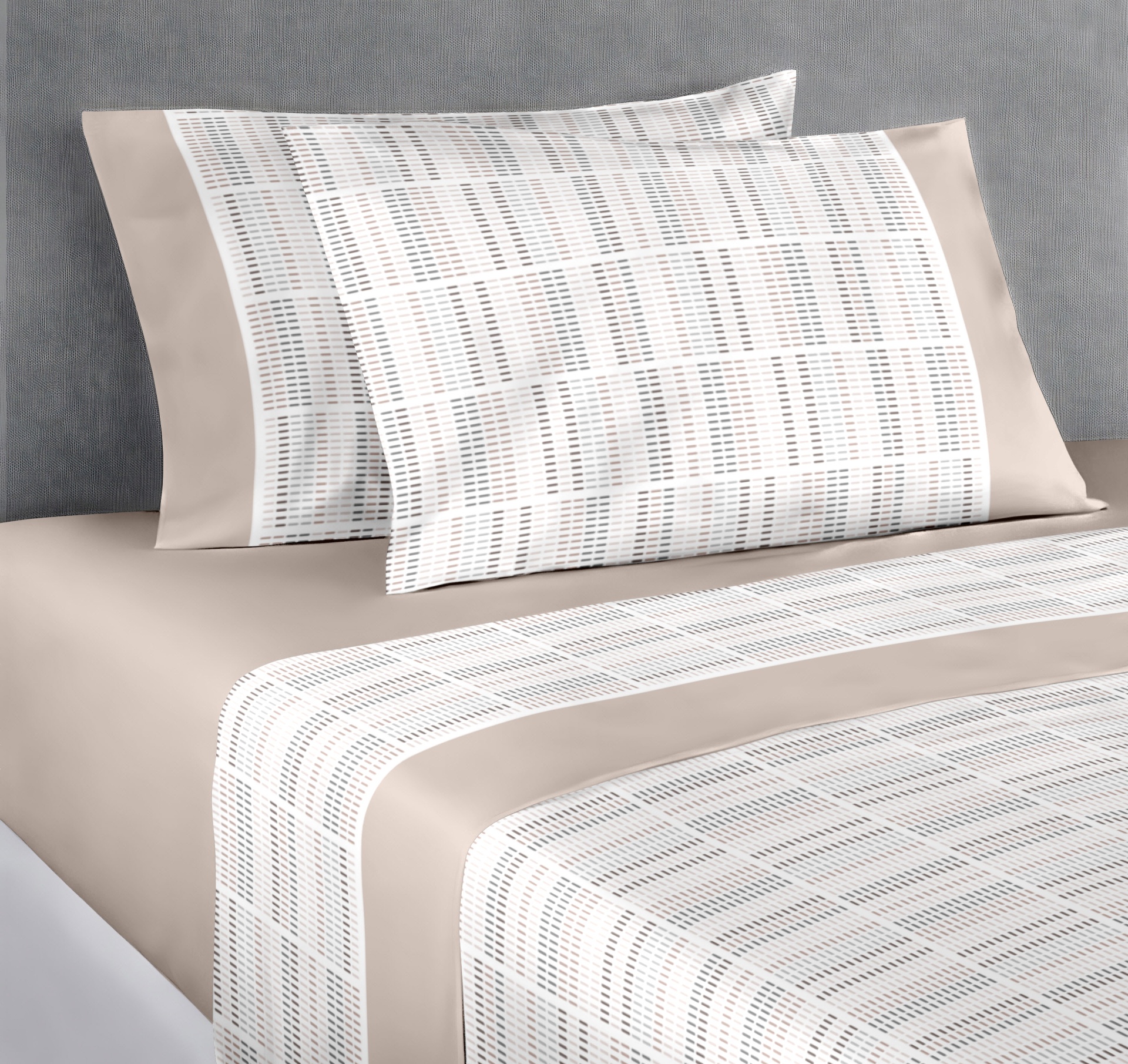 Jogo de cama em algodão, com estampado no lençol de cima e fronhas.