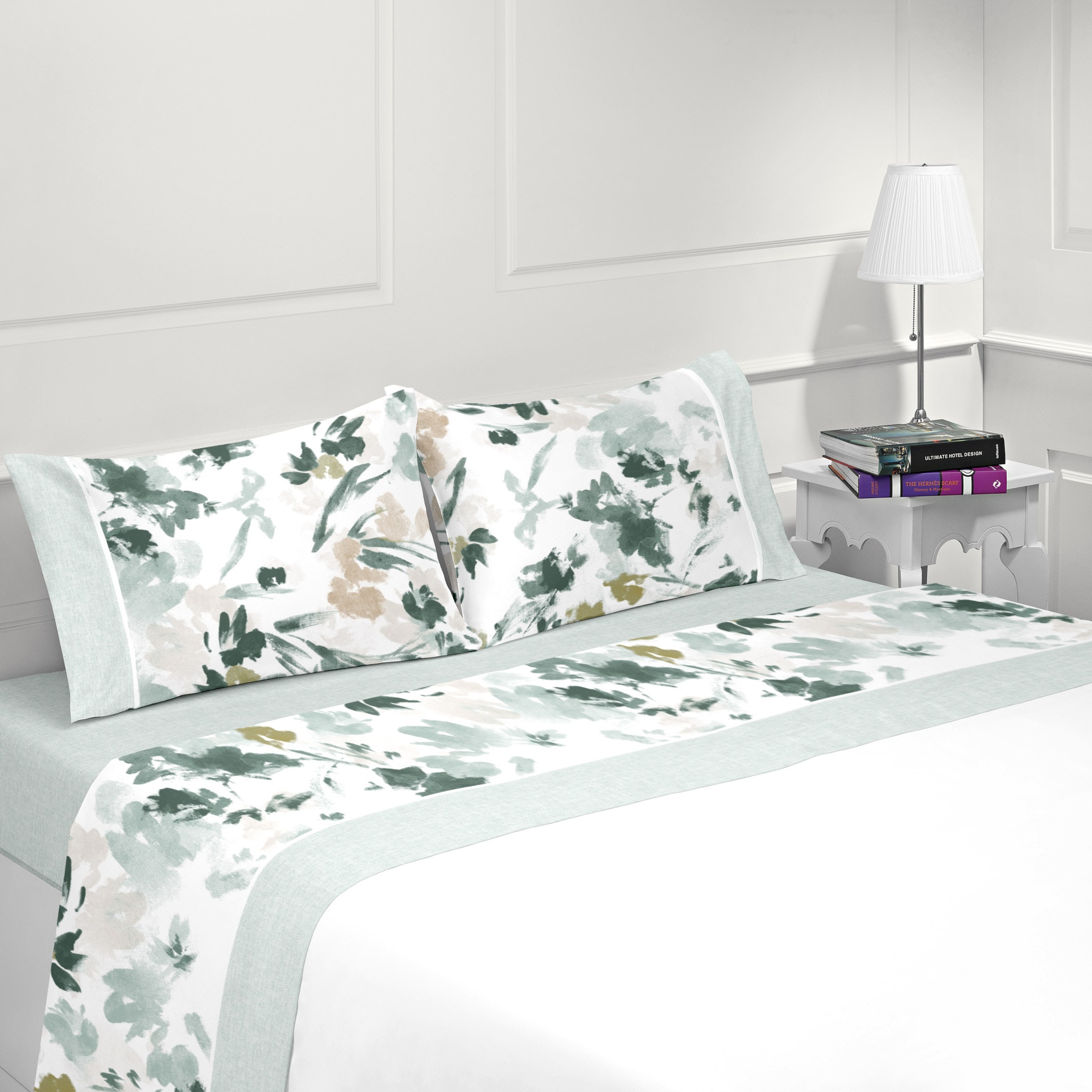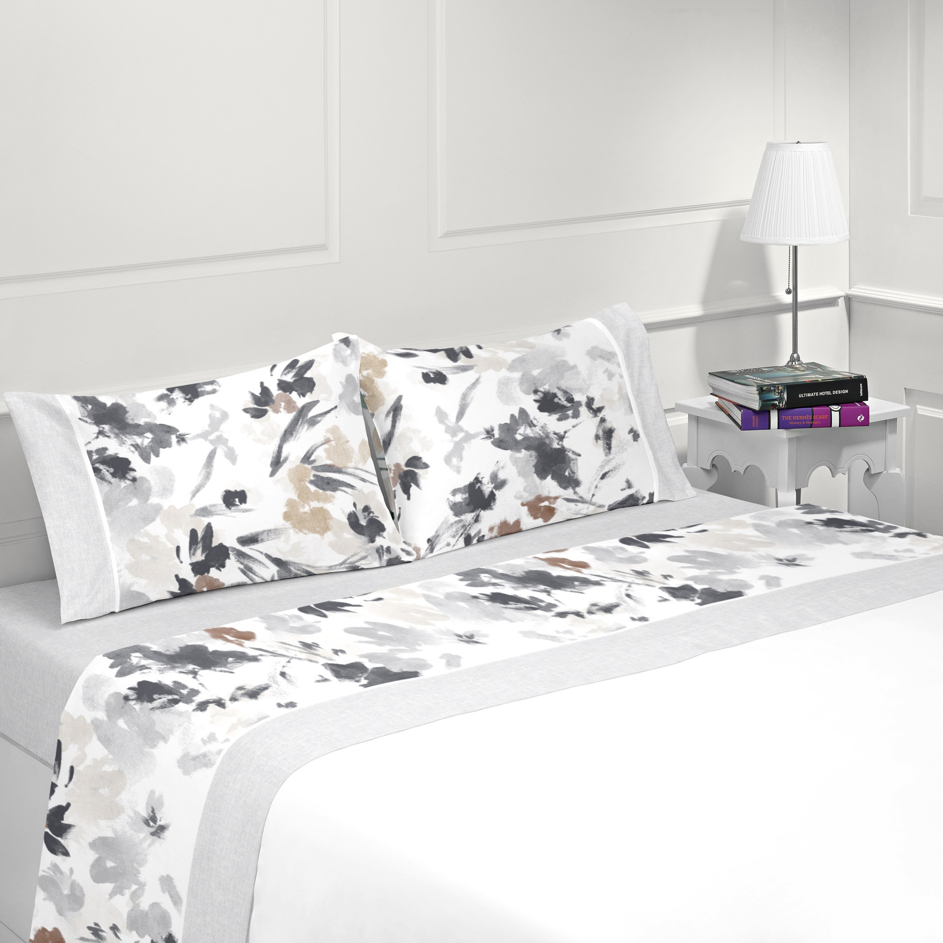 Jogo de cama em algodão, com estampado no lençol de cima e fronhas.