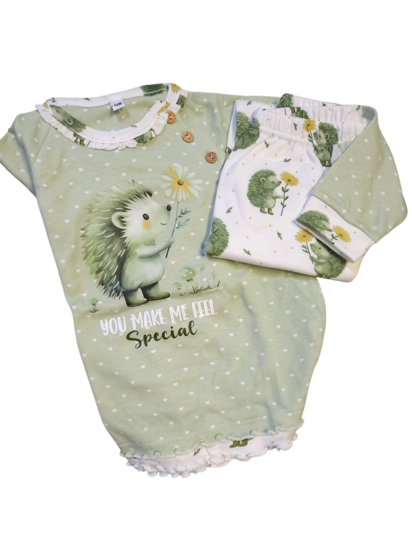 • Pijama de manga comprida e calça, com carda. Estampado na camisola e calça.