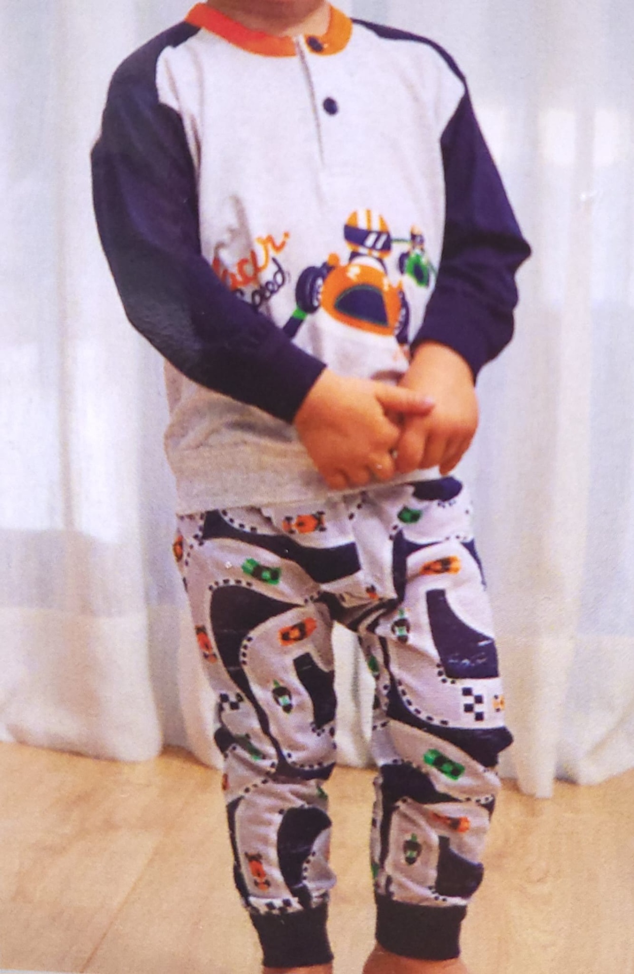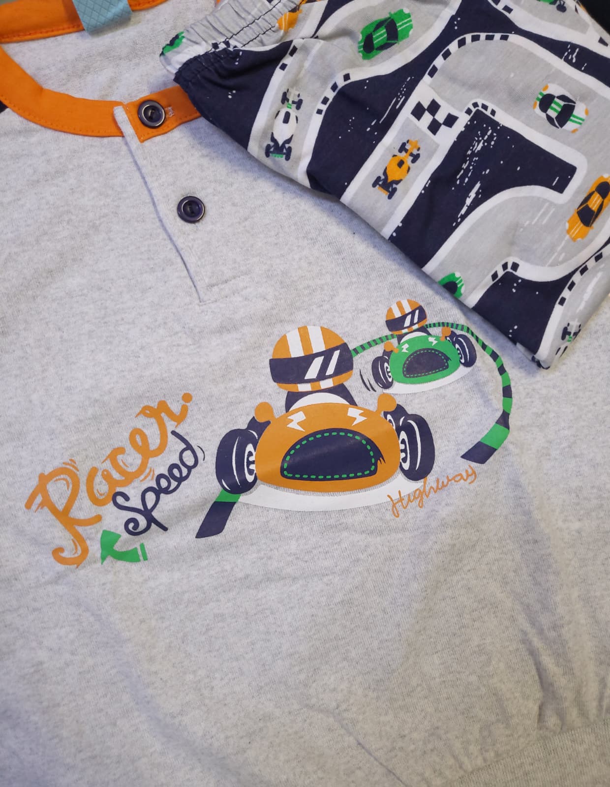 • Pijama de menino composto por camisola de manga comprida, com estampado à frente, decote redondo com botões, e calças com padrão de pistas de corrida, com punho.